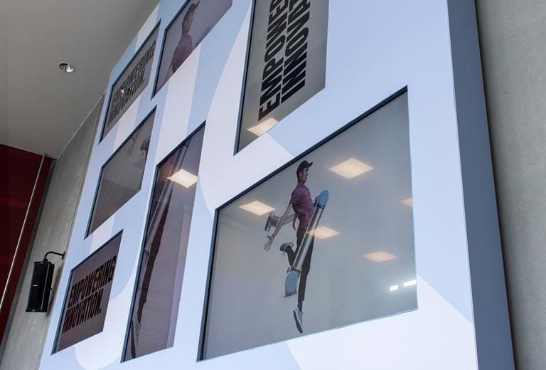 Til kantinen i hovedkvarteret i Odense er der installeret en skærmvæg med 8 stk. 65” Philips skærme. Skærmene er placeret både lodret og vandret i en specialbygget kassette med Universal Robots logo. Skærmvæggen bruges til intern formidling og branding af virksomheden. Universal Robots har selv været ansvarlige for indhold til skærmene.