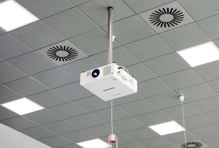 Da kantinen også bruges til stormøder, var der behov for en kraftig og lysstærk projektor. Valget faldt på en lysstærk Panasonic laserprojektor på 10.000 Ansilumen. Panasonic laserprojektoren udmærker sig ved at have konstant høj lysstyrke i hele 20.000 brugstimer uden man behøver skifte projektorens lyskilde.