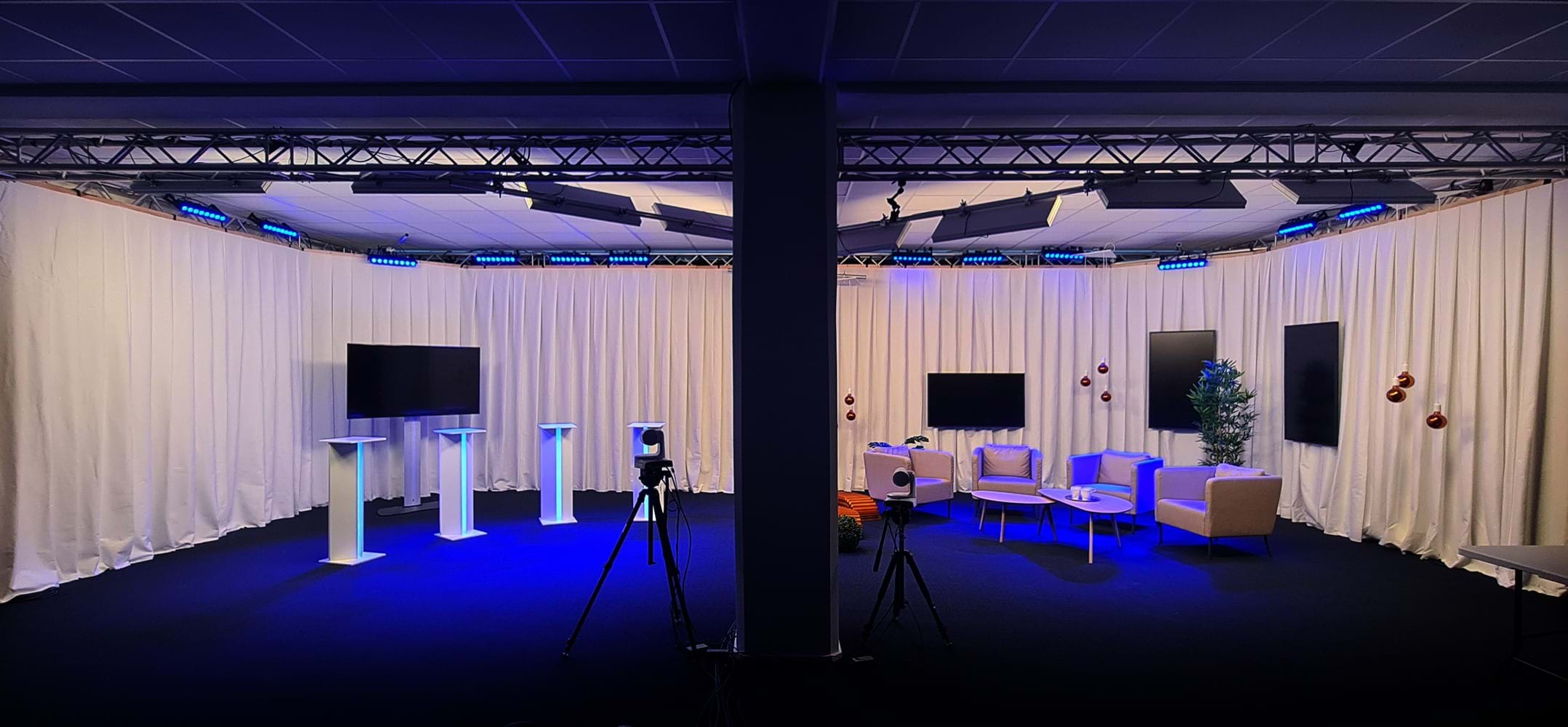 Studiet/scenen kan skabes i nøjagtig den størrelse du har brug for, og vi kan opdele det, så du har flere studier i ét med forskelligt indrettede rum, der kan klippes imellem.
