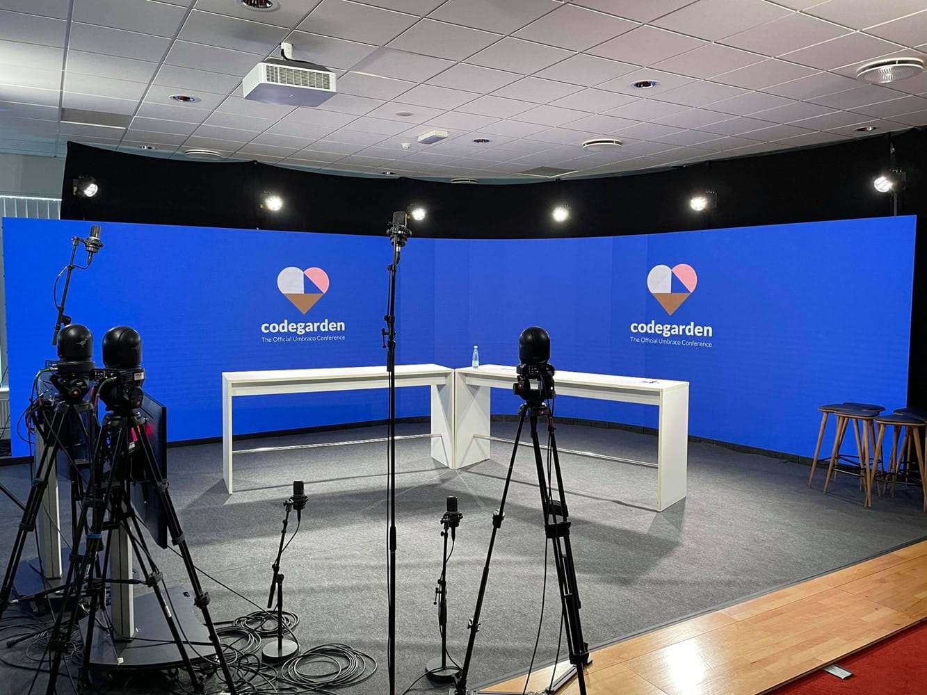 Det er også muligt at indrette et greenscreen studie, hvorfra vi kan indsætte billeder til studiets/scenens LED bagvæg. Det vil være muligt at indsætte billeder af mennesker i fuld størrelse. Det er muligt at indsætte billeder eller stille om til et hvilket som helst greenscreen studie. Så hvis du har en oplægsholder fra eksempelvis New York, skal han blot gå ind i et greenscreen studie der, så indsætter vi ham på scenen her.